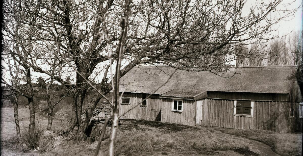 Fållses stuga i Järlöv (stavas även Folses, Fålses). Fasaden är omålad, taket belagt med stickspån (pärt) och fönsterluckan till höger har ett titthål.