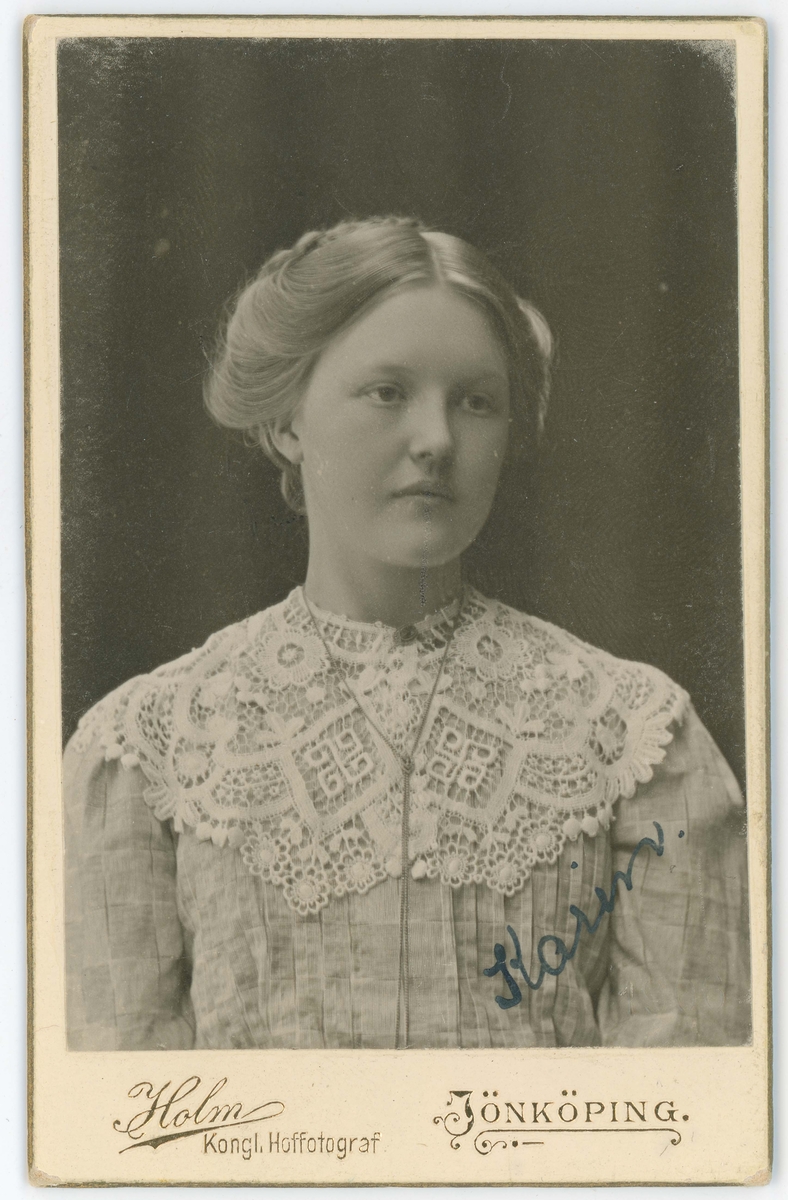 Porträtt på Karin Frykstrand, Fadern var chef för allmänna Brand i Jönköping.
