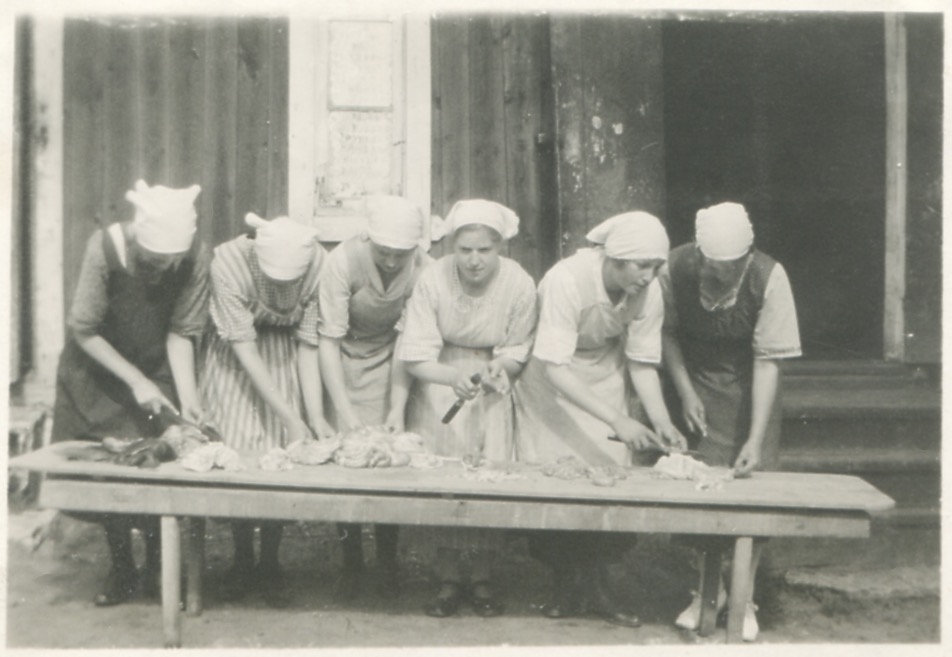 Sex kvinnor arbetar (med köttberedning?) utomhus vid ett långbord, "Nygård" Kållereds Stom 1:3 på Gamla Riksvägen, okänt årtal.