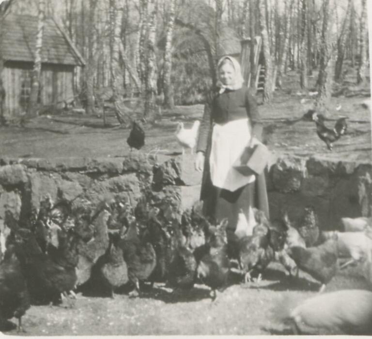 En kvinna matar gårdens hönor, "Nygård" Kållereds Stom 1:3 på Gamla Riksvägen, okänt årtal. Johan och Karolina Gustafsson byggde och brukade gården.