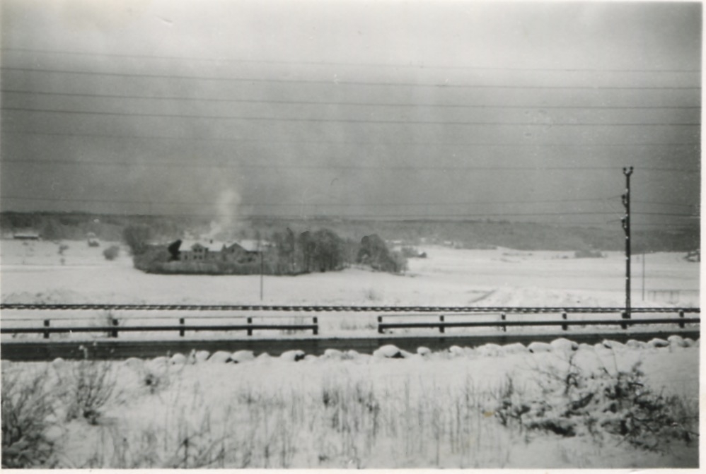Vy västerut från "Nygård" Kållereds stom över Ekans gård och Heljered som är snöbelagt, okänt årtal. Närmast ses Gamla Riksvägen och järnvägen.