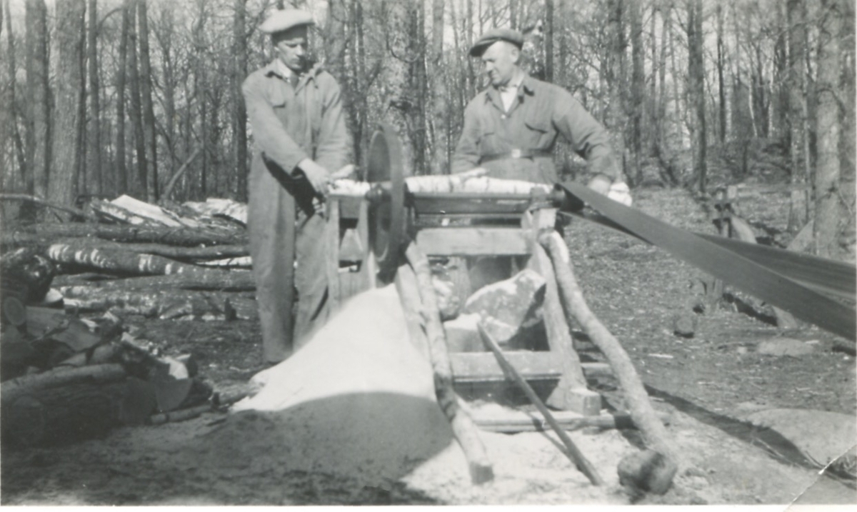 Kållered Stom "Nygård" okänt årtal. Två män kapar ved. Mannen till höger är John Johansson (1898 - 1966).