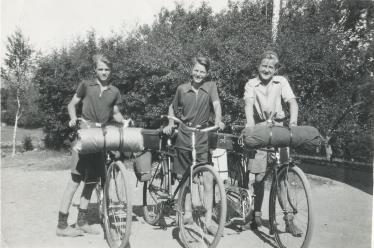 Tre killar är på cykelutflykt, Backen eller Högen 1940. Från vänster: Gunnar Pettersson, brodern Karl Gustav Pettersson och kusinen Lars Olof "Lasse" Pettersson.