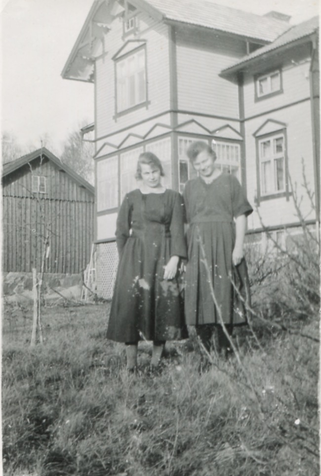 Systrarna Astrid (1907 - 1994, gift Jägerström) och Ingeborg Gustafsson (1901 - 1987, gift Johansson) står utanför hemmet, Kållered Stom "Nygård", 1920-tal. Deras föräldrar ägde gården.