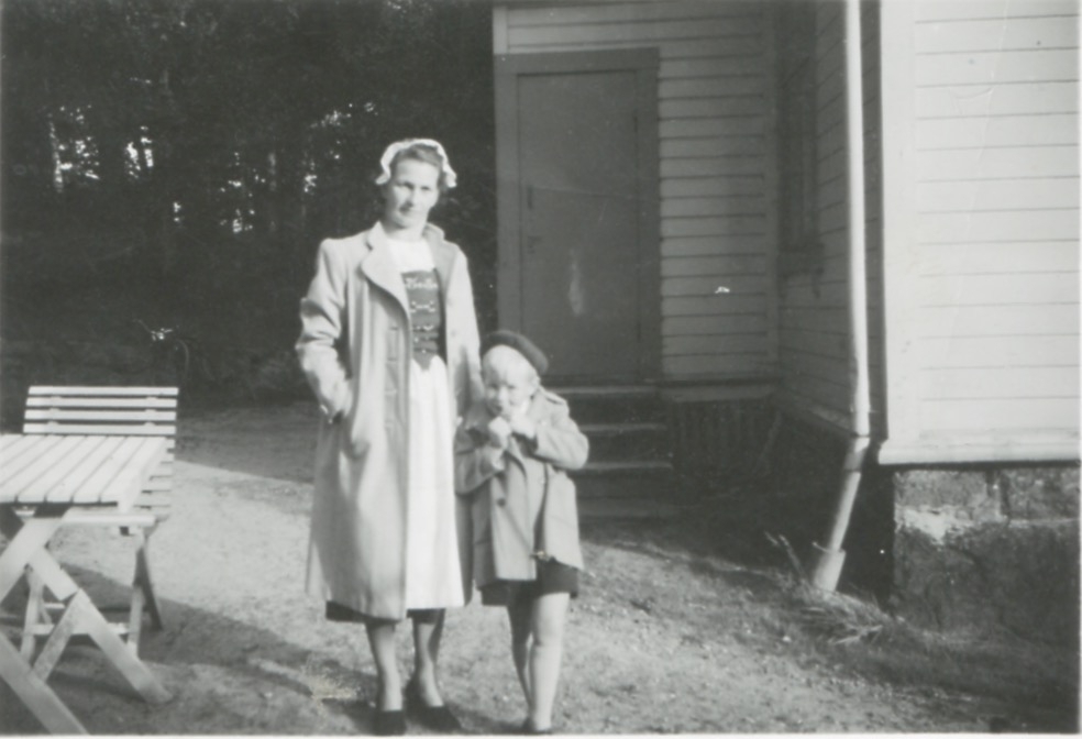 Kållered Stom "Nygård" cirka 1950. Ingeborg Johansson (1901 - 1987, född Gustafsson) och sonen Lars (född 1945) står på gårdsplanen utanför bostaden. Ingeborg bär Bohusdräkten som hon under 1930-talet har sytt tillsammans med väninnor i SLU (Svenska Landsbygdens Ungdom, blev senare CUF).