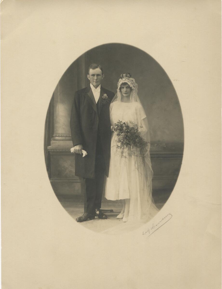 Livered Backen eller Högen 1923-09-20. Bröllopsfoto av Birger Pettersson (1891 - 1970), Livered Högen, och Ester Pettersson (1894 - 1988, född Fredriksson), Livered.