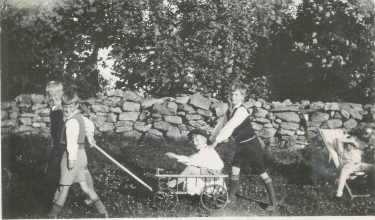Fyra pojkar leker vid Backen eller Högen (nedre gården), okänt årtal. Från vänster ses Lars Olof "Lasse" Pettersson och kusinen Gunnar Pettersson, Högen, som drar i skrindan. I skrindan sitter sommargästen Åke Bergendahl. Karl Gustav Pettersson, Högen, skjuter på.