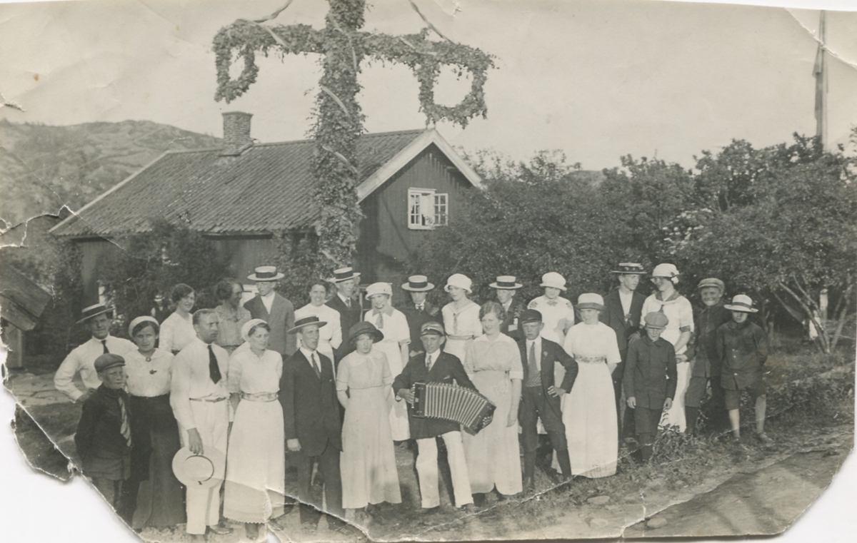 Sommargäster firar midsommar vid Torrekulla "Månses" (fotografen Bernhard Olssons föräldrahem), okänt årtal.