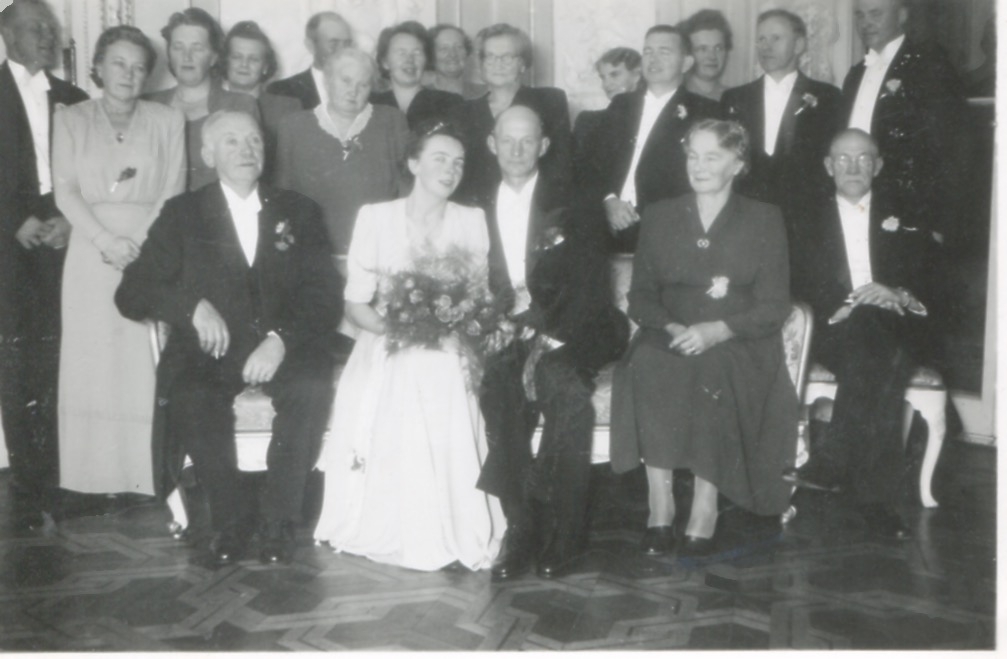 Backen eller Högen 1947-10-18. Bröllop mellan Anselm Zackrisson (1900 - 1987), dräng hos Alfred Larsson, Högen, samt Margit Zackrisson (1909 - 1976). Med på bild är bland annat Vanda och Paul Andersson, Elin Pettersson samt Ingrid Skansing.