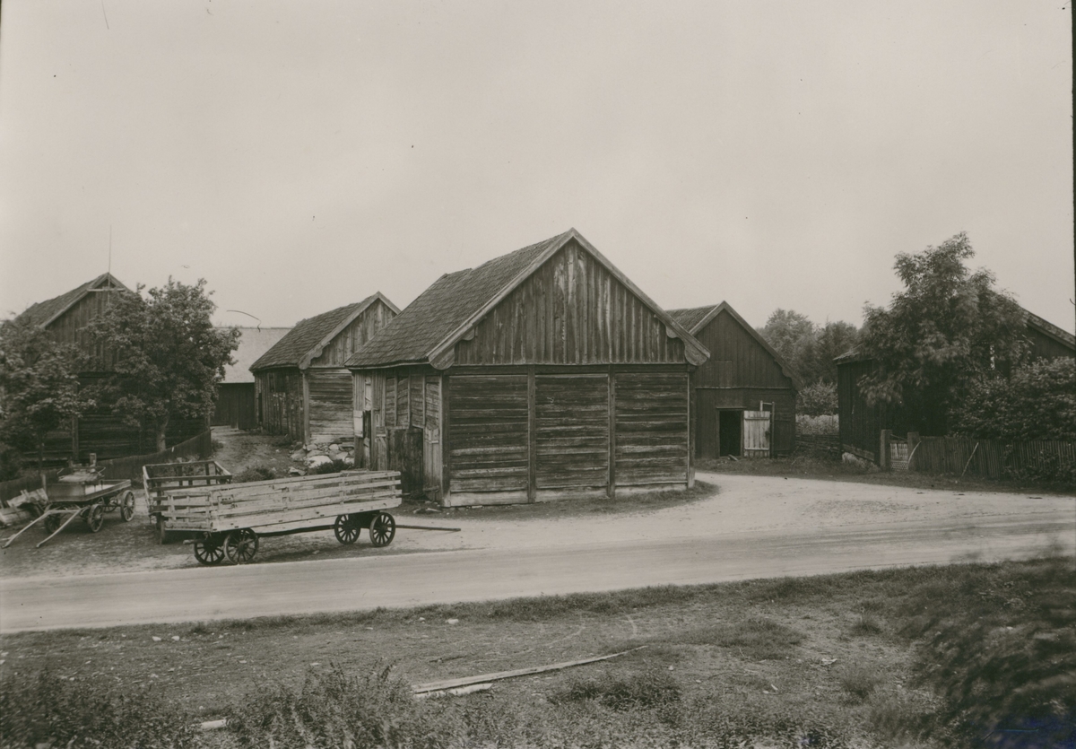 Loge, ladugårdslänga, två stall samt bod. De två byggnaderna åt höger tillhör Johansson. Ägare: t v Hulda Svensson med Rikard Jonsson som brukare, t.h Karl Johansson.