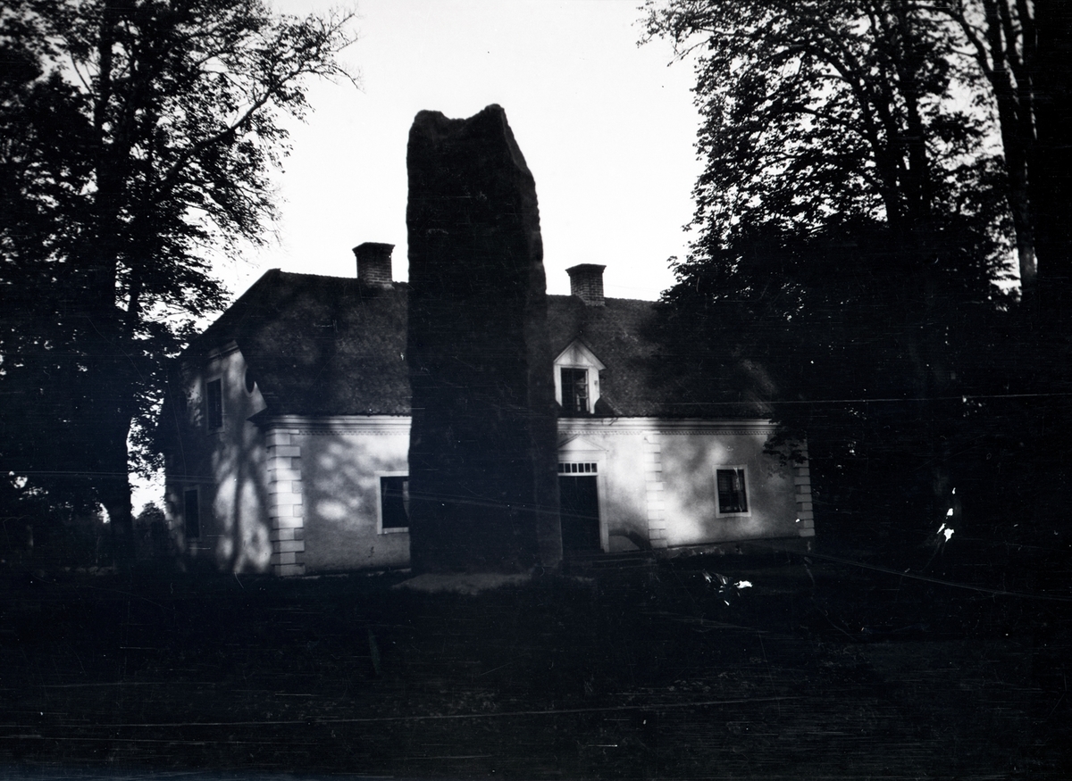 Minnestenen framför trädgårdsflygeln på Tuna gård.
