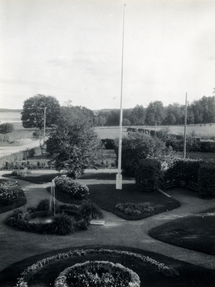 Trädgården på Tuna gård med Tunasjön i bakgrunden.
