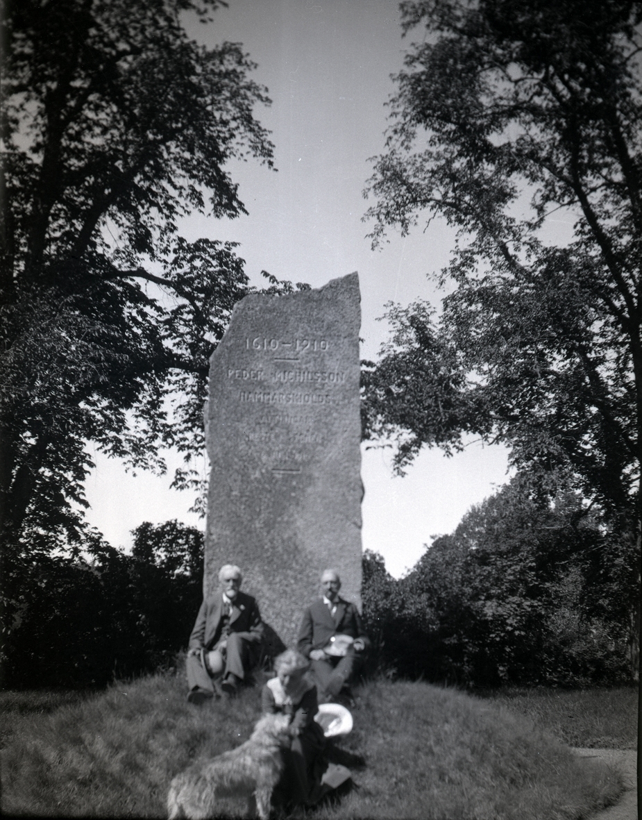 Hugo Hammarskjöld, eventuellt Nina Hammarskjöld och en man framför Peder Michilssons minnessten. Det är en minnessten över att det var 300 år sedan den första Hammarskjöldaren blev adlad.