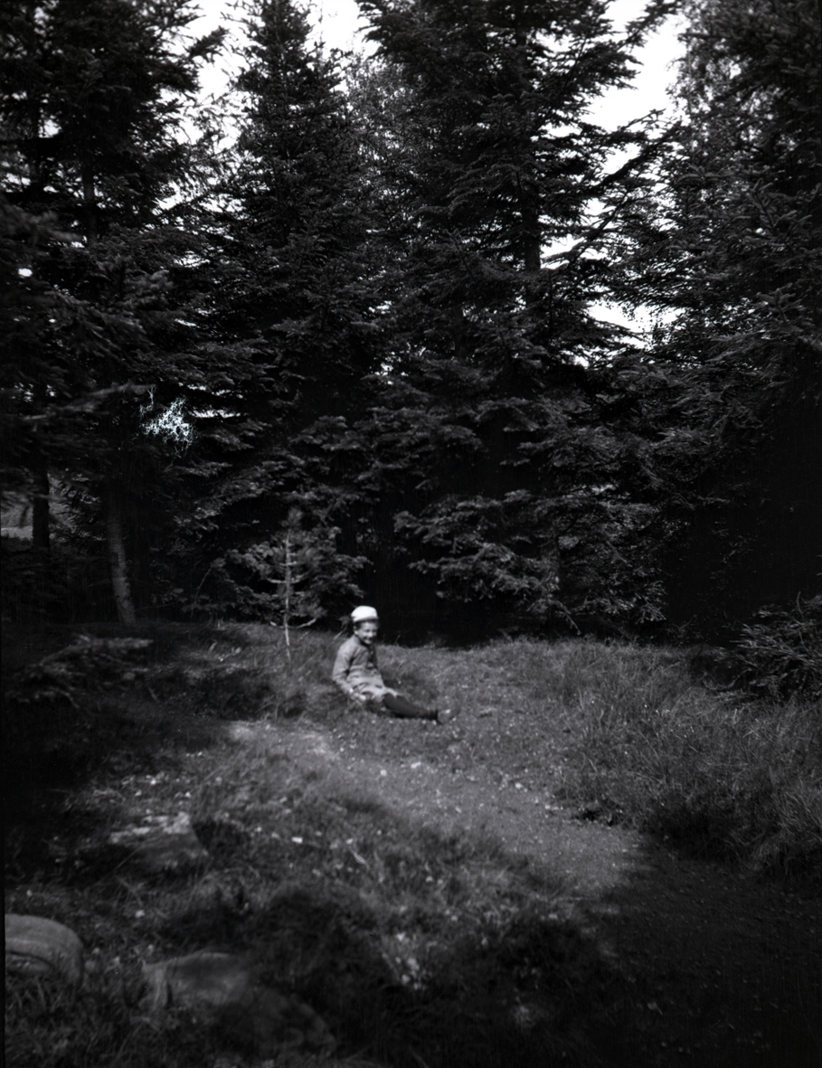 En pojke sitter i gräset i skogen i närheten av Tuna gård.