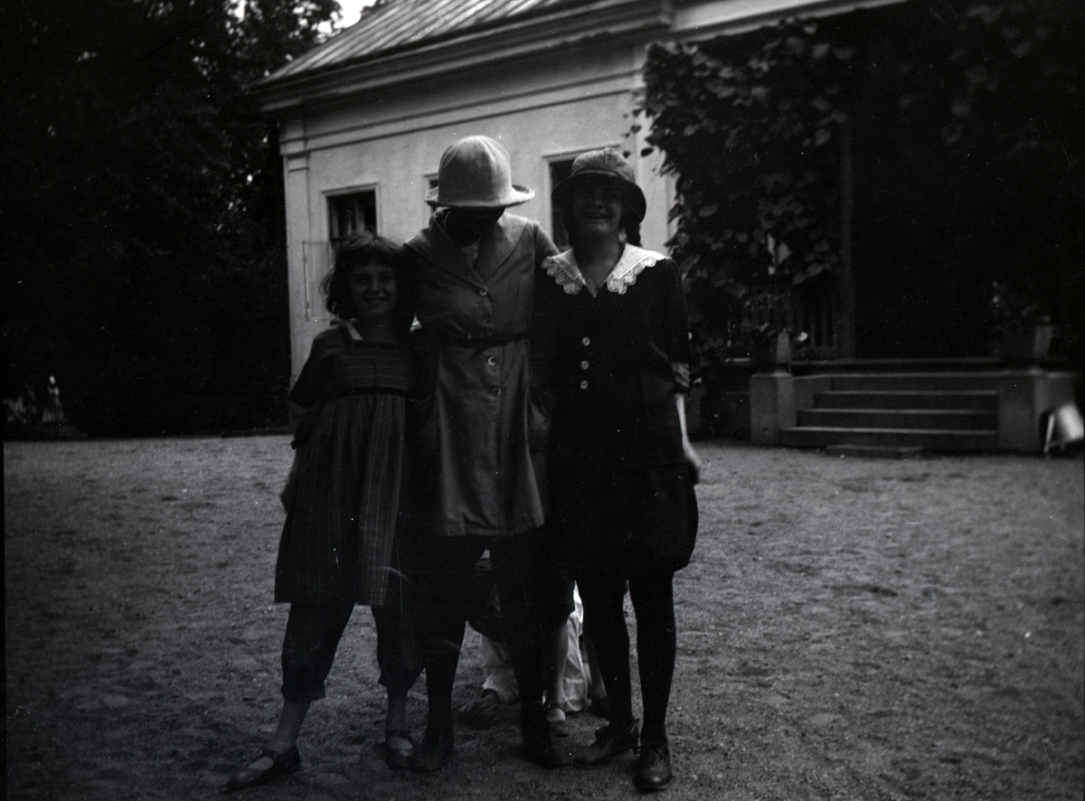 Fyra personer på Tuna gård. Sigrid, Ika och eventuellt Irma. Okänd bakom.