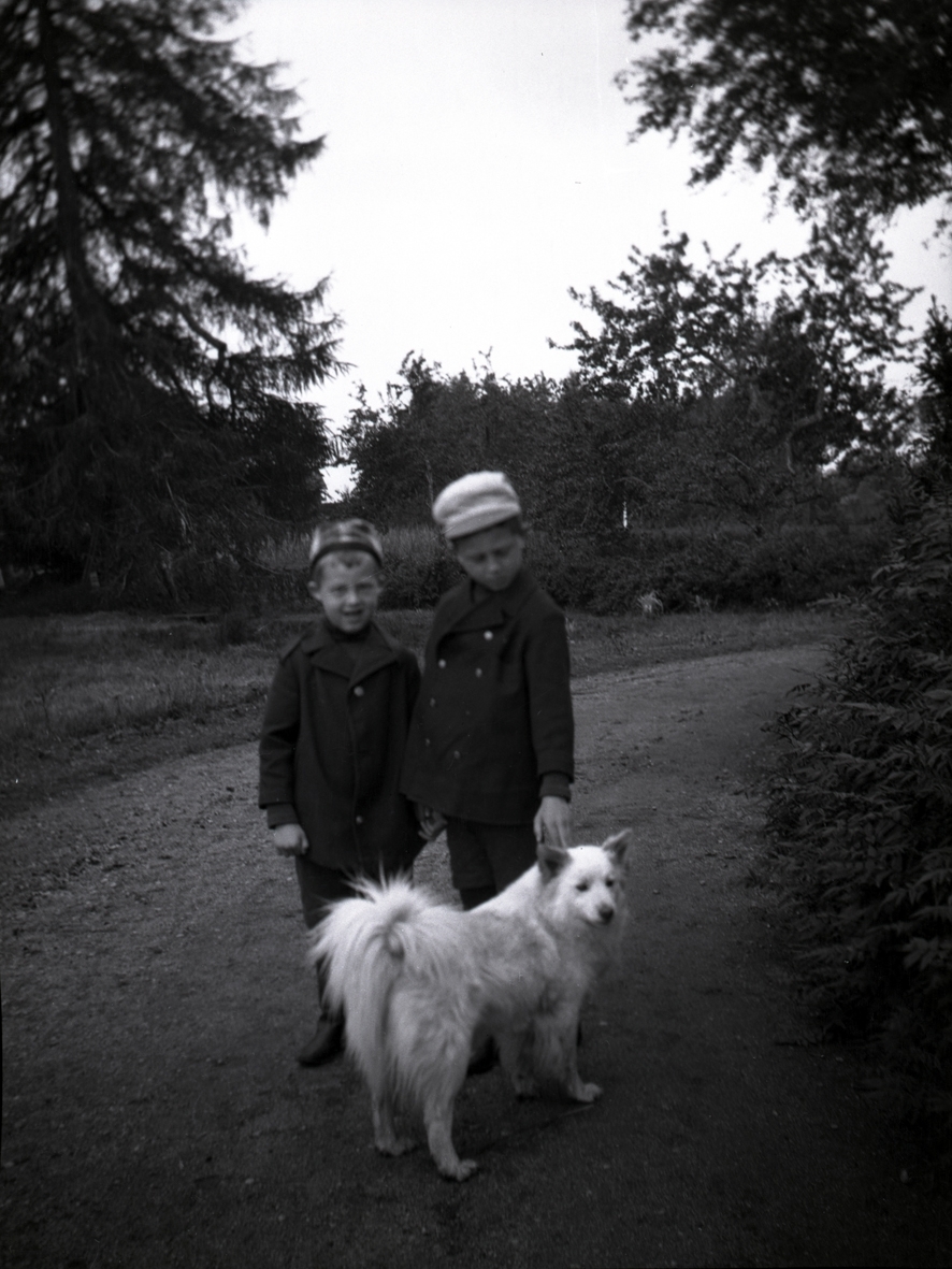 Hugo och Carl Henrik med möjligen hunden Skoj på Tuna gård.