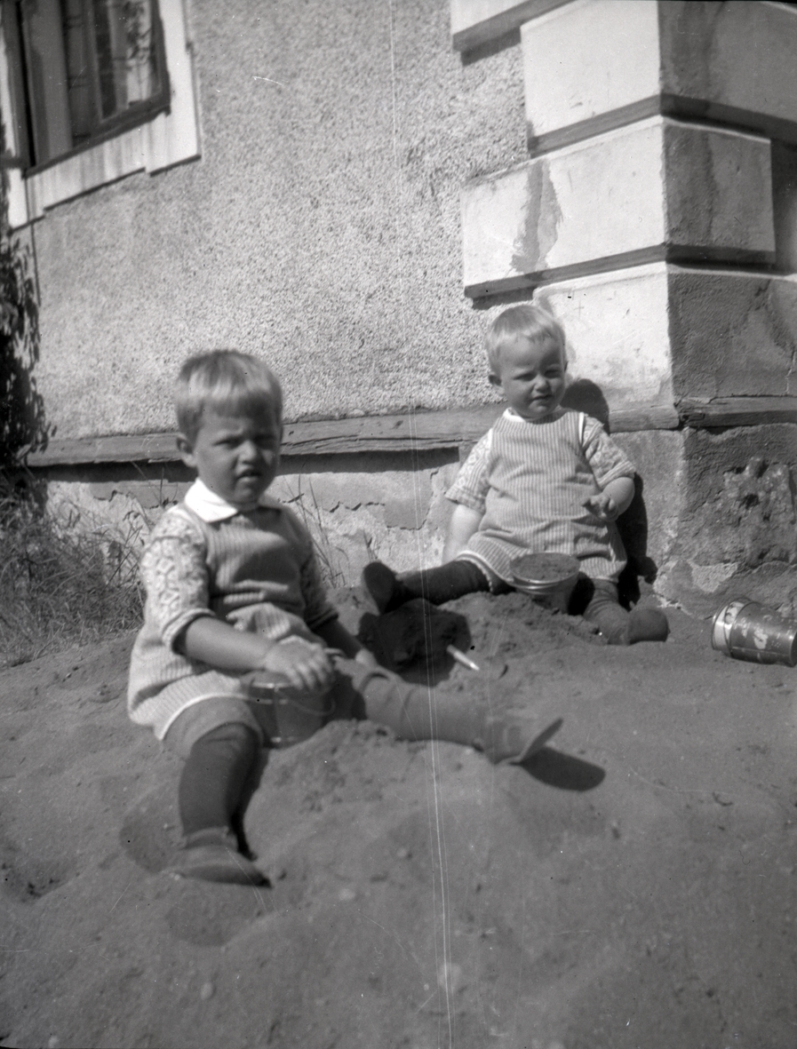 Halmstadspojkarna Lars och Sven leker i sanden på Tuna gård.
