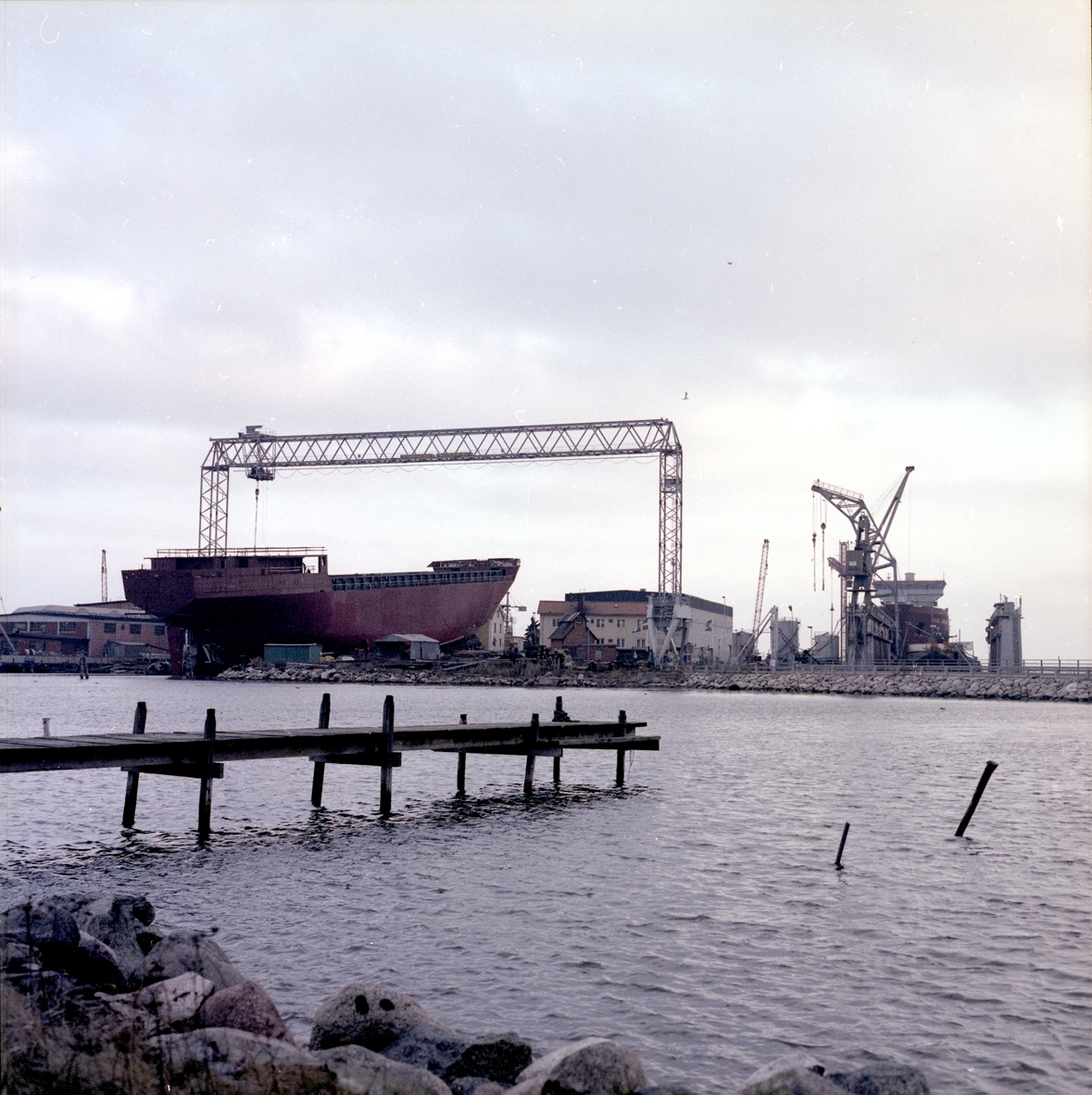 Ett fartyg som byggs under en bockkran på varvet.