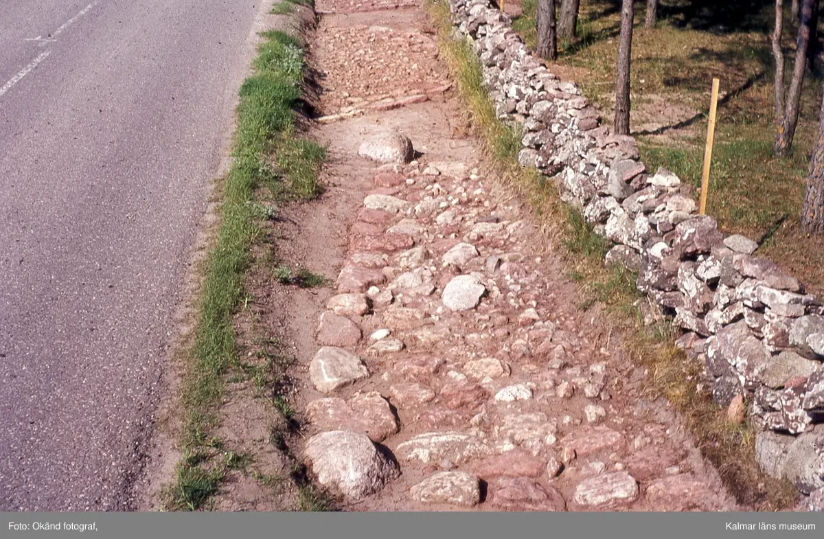 Utgrävning mellan väg och stenmur. Okänd ort.