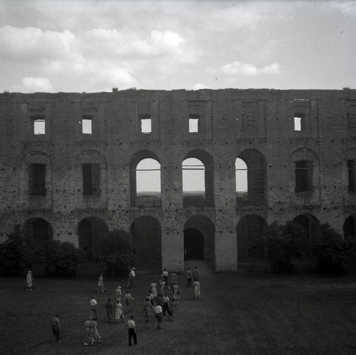 Besökare vid portalerna till Borgholms slottsruin.