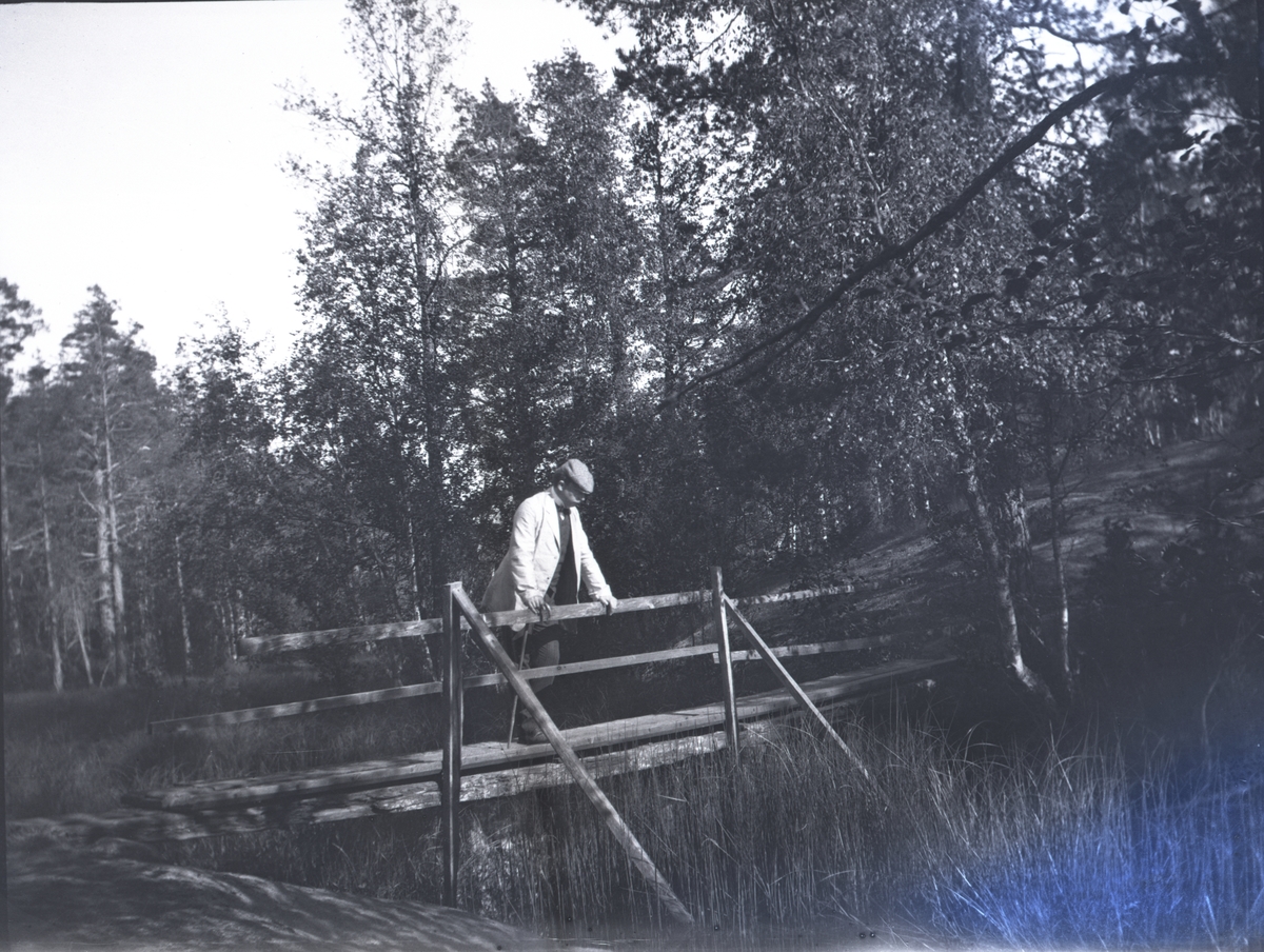 En person vid ett broräcke i en skog i närheten av Tuna gård.