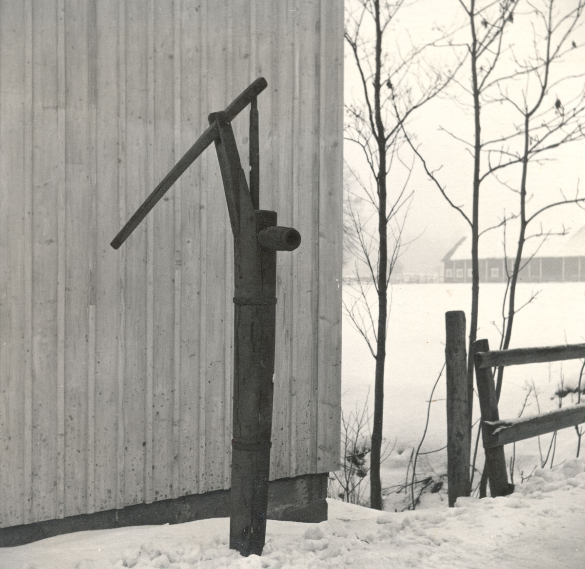 Titel: Nyebo brunn. Pump av trä, använd vid hälsobrunnen.