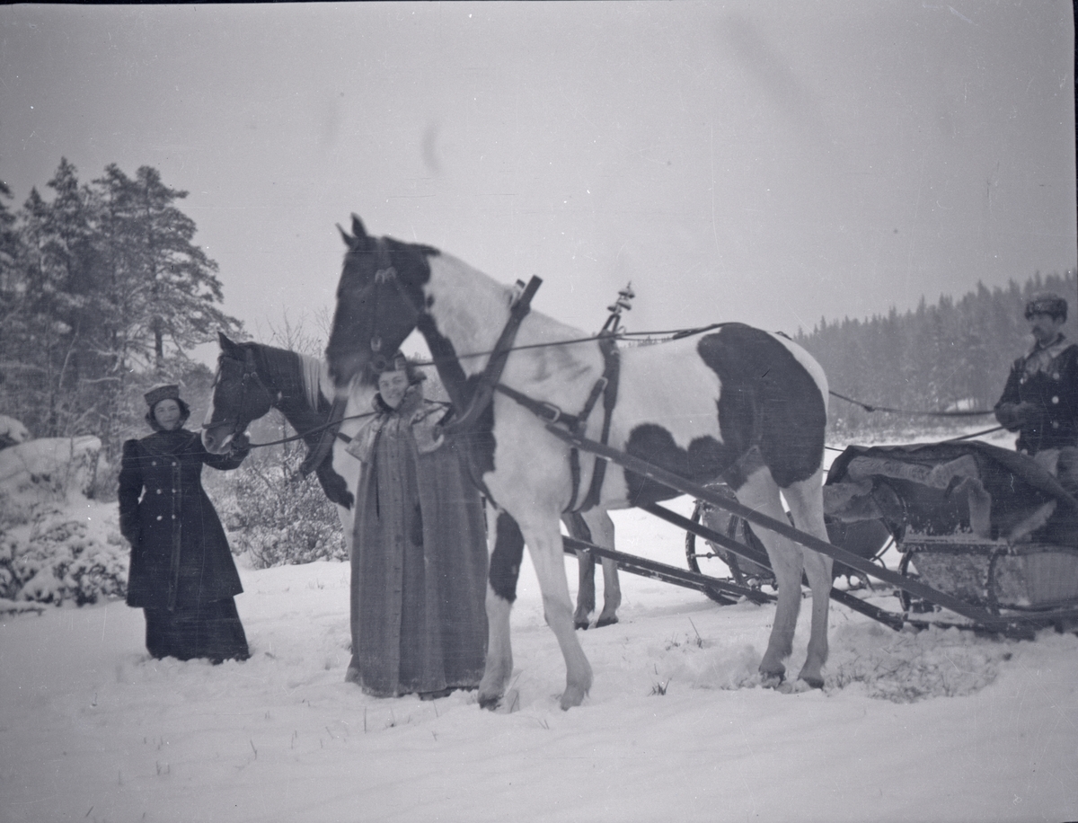 Två damer och en herre samt två hästar som är spända för slädar. I närheten av Tuna gård.
