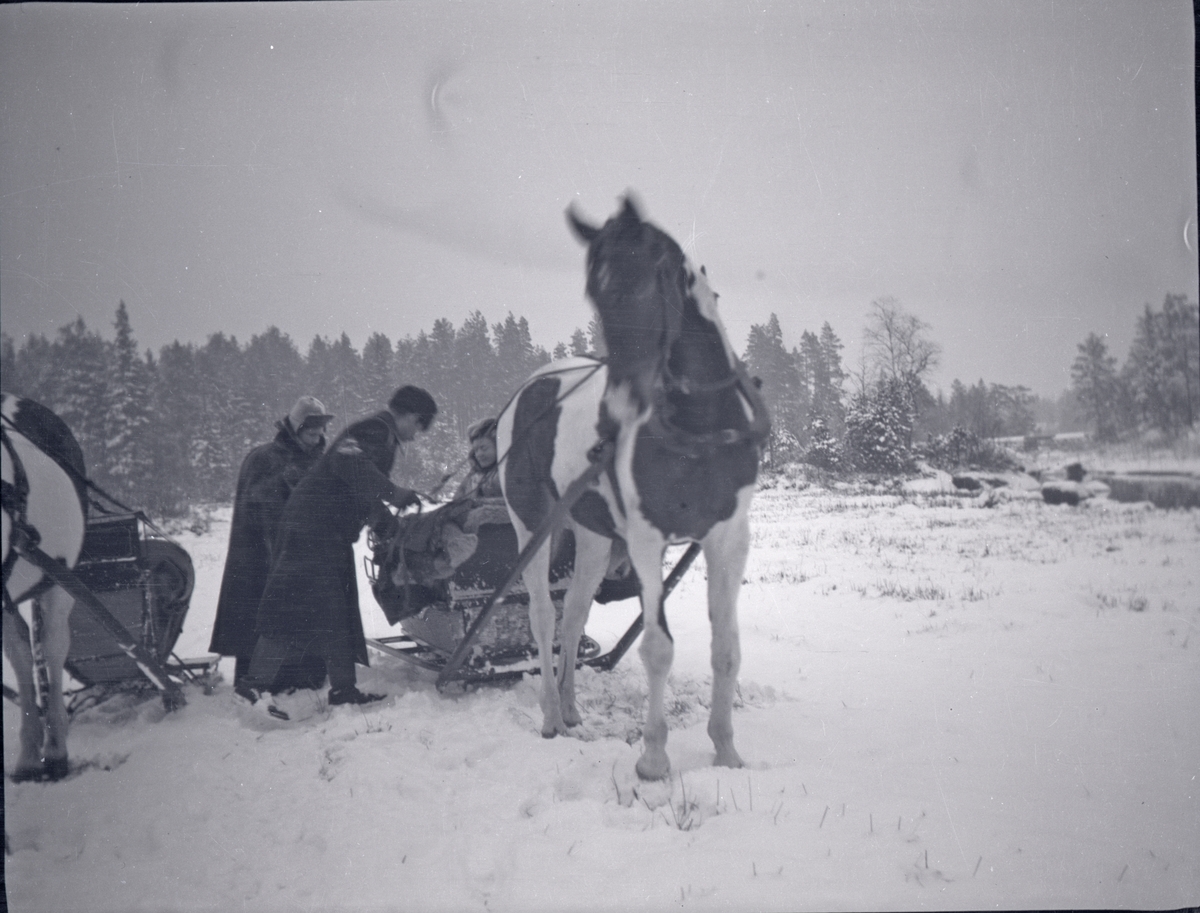 Två damer och en herre samt två hästar som är spända för slädar. I närheten av Tuna gård.