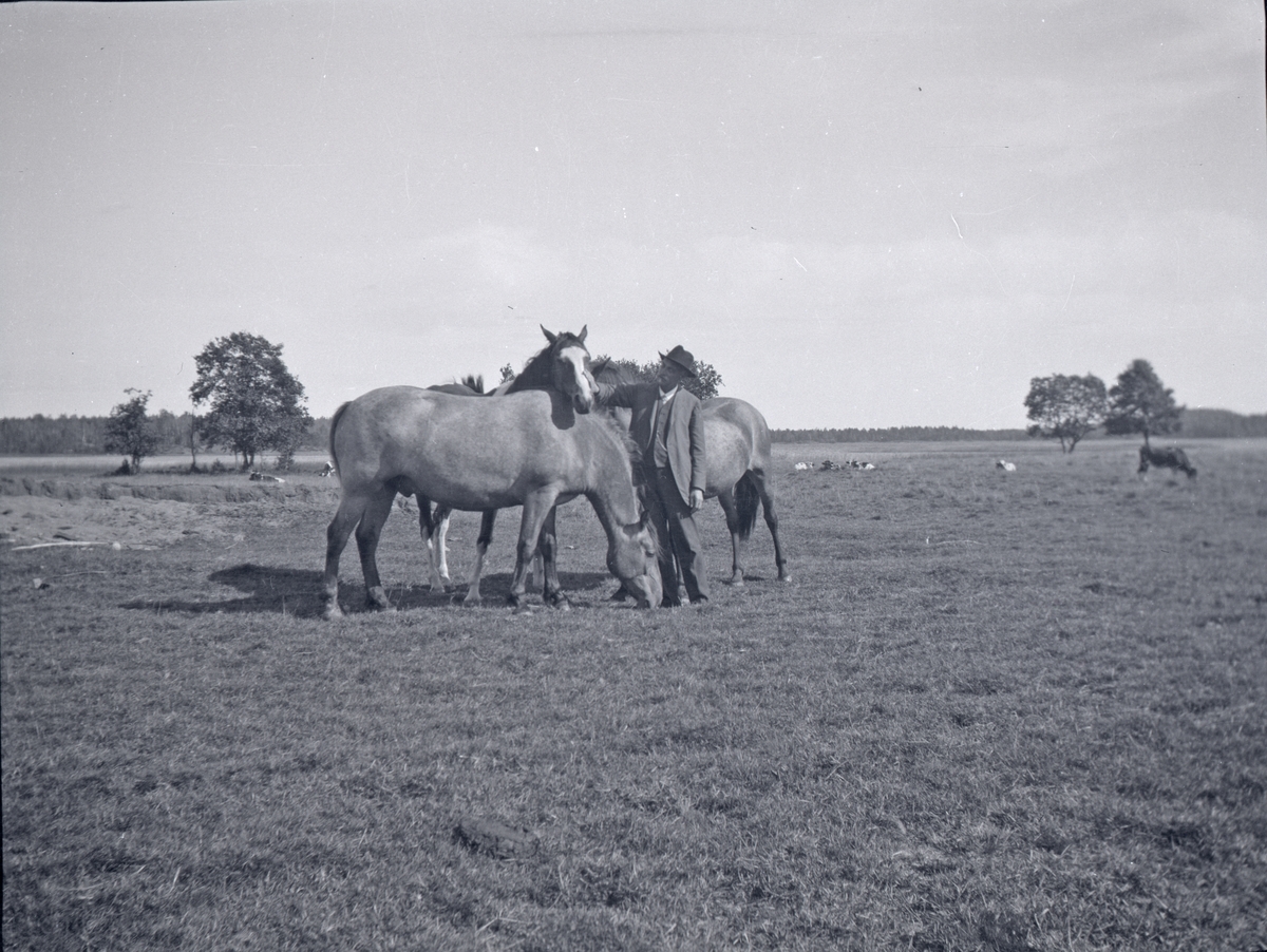 Hugo Hammarskjöld med tre hästar vid Tuna gård.