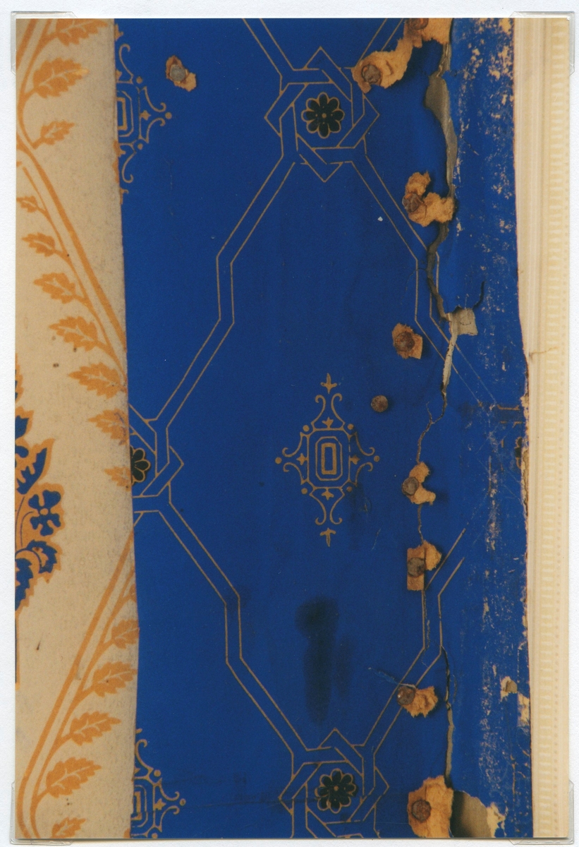 Titel: Harbergska gården, sydvästra kammaren i bottenvåningen, tapet. Harbergska gården är ett byggnadsminne som ligger i Pataholm, Mönsterås kommun. Det är en köpmansgård som troligen är uppförd på 1840-talet. Gården är timrad i två våningar under tegeltak och har locklistpanel. I bottenvåningen finns inredning från 1880-talet, då huset användes för bad- och brunnsverksamhet.