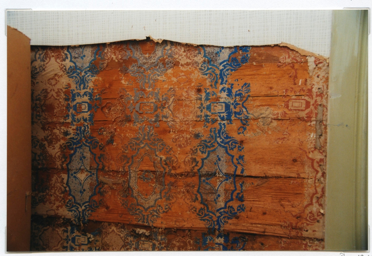 Titel: Harbergska gården, nordvästra kammaren i bottenvåningen, väggmålning. Harbergska gården är ett byggnadsminne som ligger i Pataholm, Mönsterås kommun. Det är en köpmansgård som troligen är uppförd på 1840-talet. Gården är timrad i två våningar under tegeltak och har locklistpanel. I bottenvåningen finns inredning från 1880-talet, då huset användes för bad- och brunnsverksamhet.