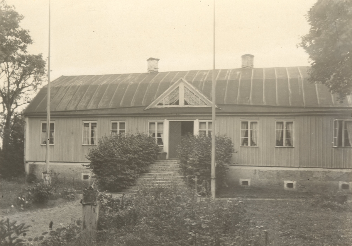 Huvudbyggnaden, uppförd 1823. Gulmålat. Trappans övre plan utgörs av en gravflisa, daterad 1671.