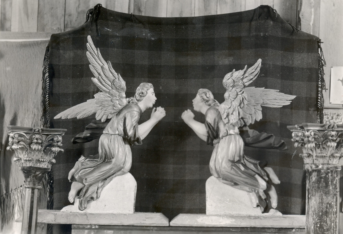 Träskulpturer ur gamla kyrkans 1700-talsinredning. Änglar i altaromfattning.