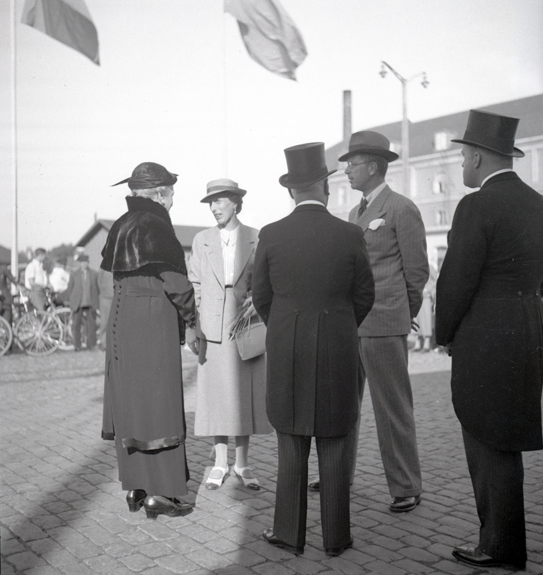 Kronprinsessan Louise och kronprins Gustaf Adolf samtalar med högtidsklädda män.
