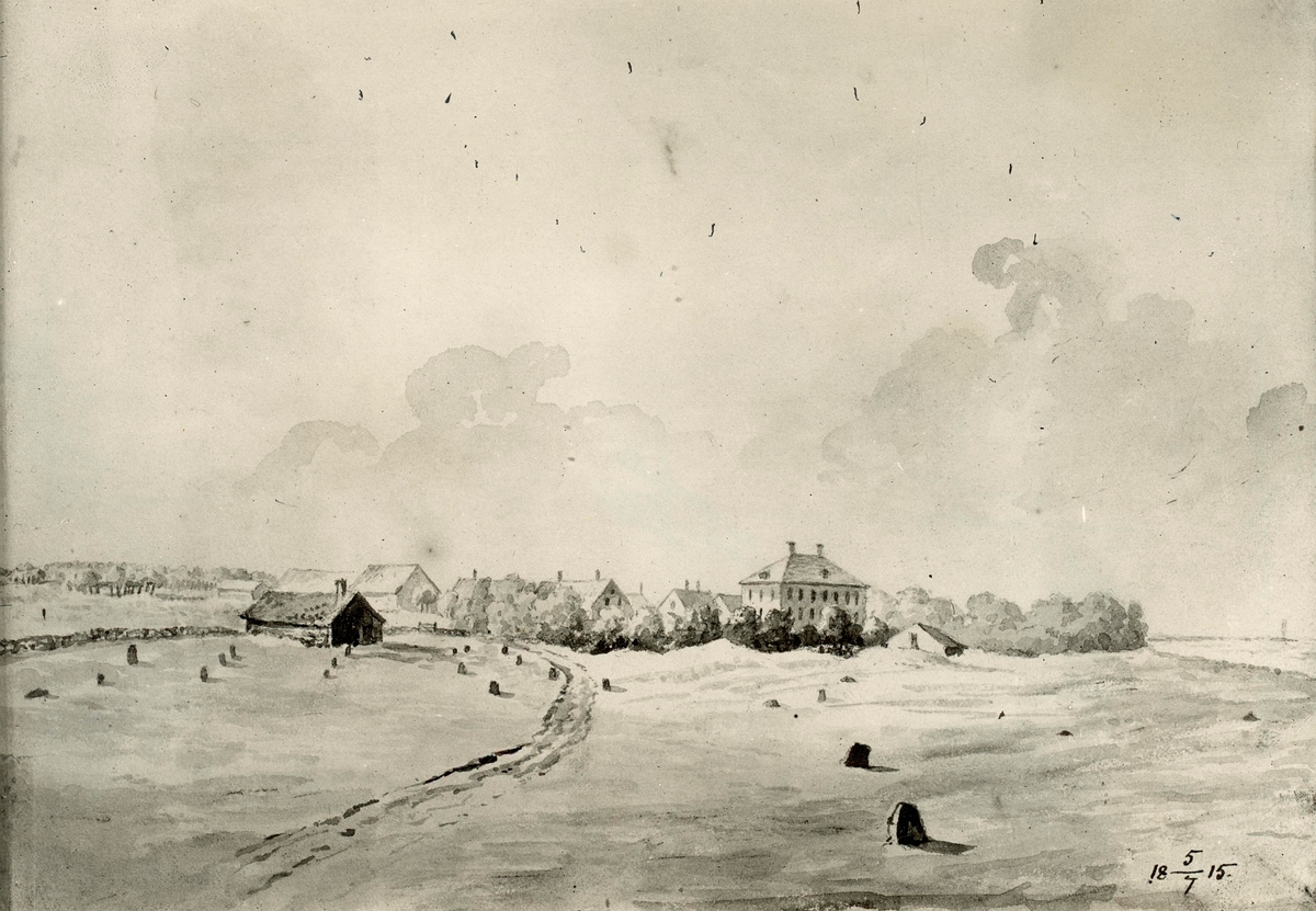Titel: Ottenby 1815. Akvarell av Jonas Carl Linnerhielm. Ottenby kungsgård är en herrgård i Mörbylånga kommun. Ottenbys nämns första gången i skrift år 1282. Under medeltiden omfattade Ottenby 19 gårdar och tillhörde Nydala kloster. Gårdarna drogs in av Gustav Vasa och gjordes till kungsladugård med schäferi och stuteri. Ett statligt stuteri för hästar till armén fanns 1831-1892. Även senare fortsattes stuteriverksamheten och många framgångsrika halvblodshästar föddes upp på Ottenby. Till kungsgårdens byggnader hör huvudbyggnaden med flyglar, ruiner av äldre uthusbyggnader, samt Karl X Gustafs mur, som begränsade kronans egendom mot norr och uppfördes 1654-55 för att stänga in de kungliga dovhjortarna i lunden. Huvudbyggnaden uppfördes 1804 efter ritningar av hovintendent Carl Fredrik Sundvall. Det är en vitputsad stenbyggnad med valmat tak. Flygelbyggnaderna är uppförda i kalksten under slutet av 1700-talet.Sedan 1935 är Ottenby kungsgård ett statligt byggnadsminne. Gården ägs av Statens fastighetsverk. Källa Wikipedia 2009-10-23.
