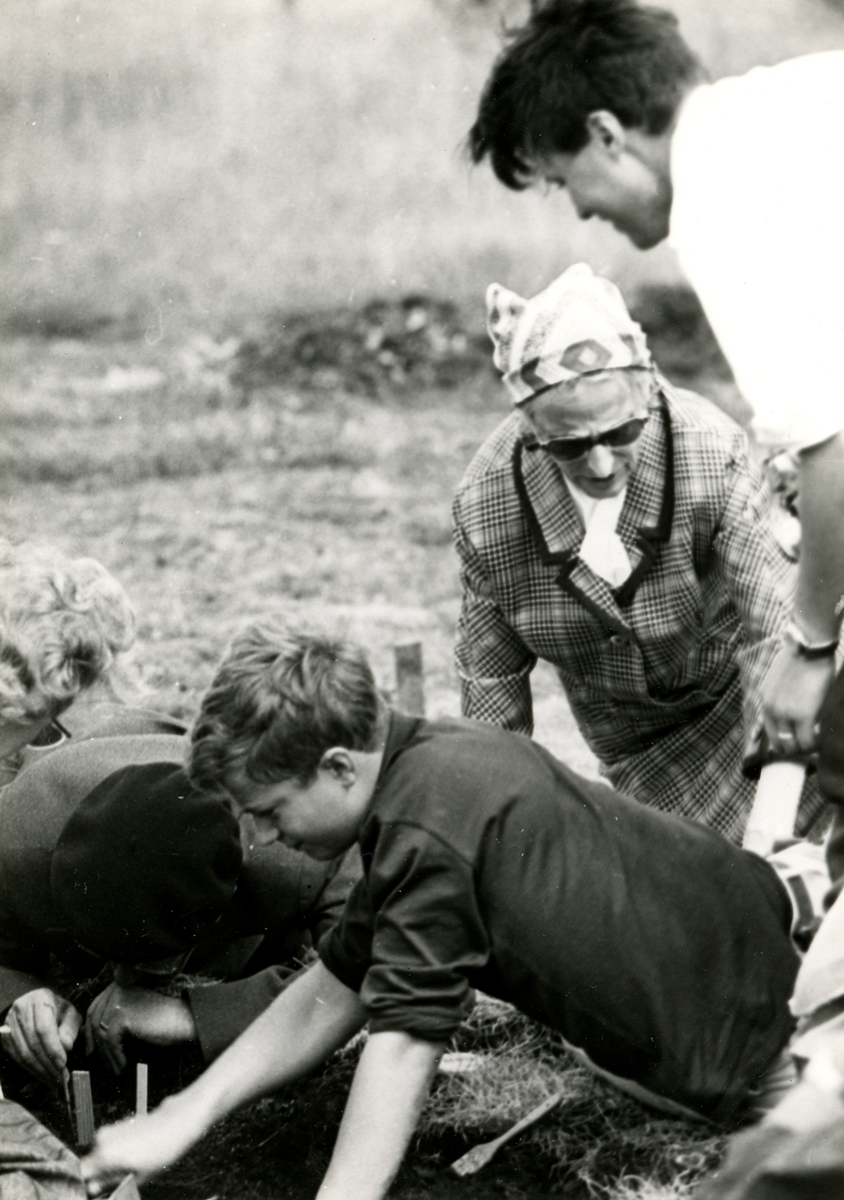 Dåvarande kronprinsen Carl Gustaf och prinsessan Sibylla deltar i utgrävningarna vid Skedemosse under överinseende av Ulf Erik Hagberg.