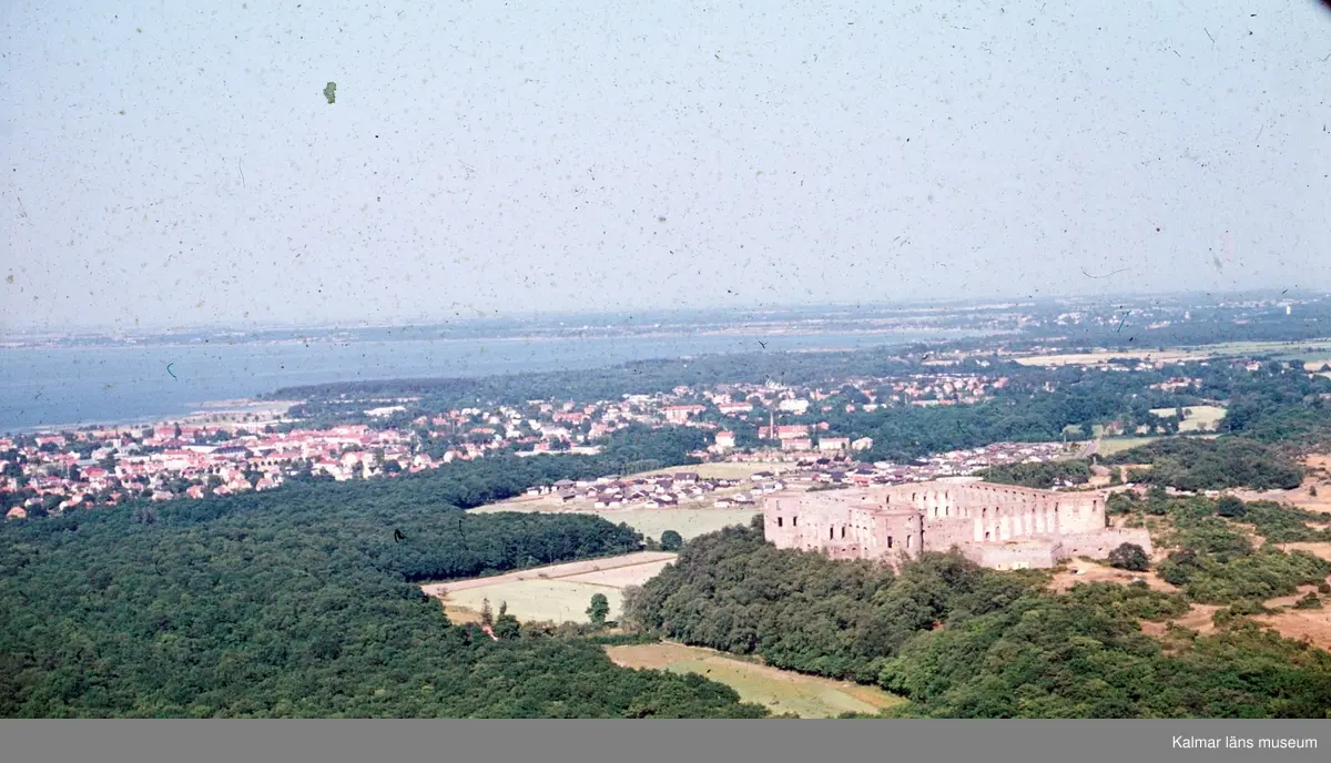 Flygbild över Borgholm med slottsruinen i förgrunden.