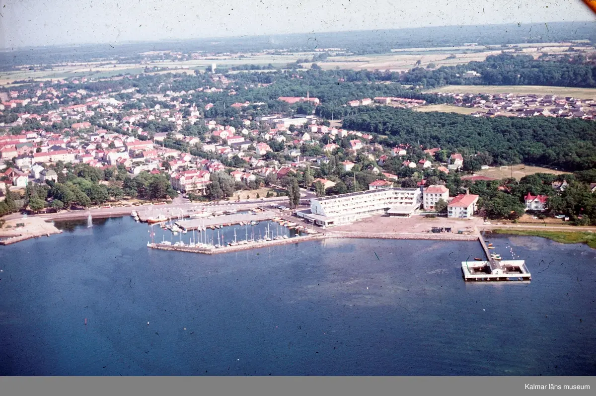 Flygbild över Borgholm med hamnen och Strand hotell i förgrunden samt kallbadhuset i vattnet.
