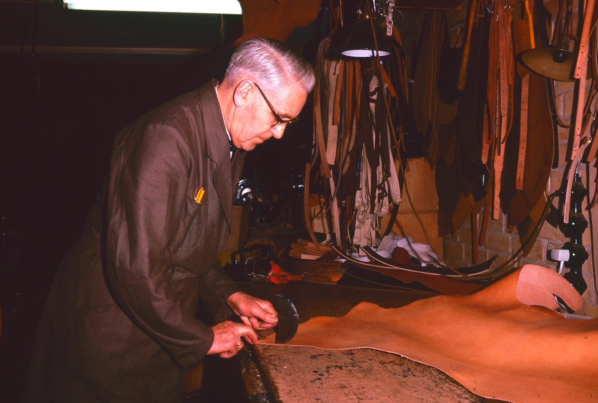 Man som skär ut skinndetaljer ur ett skinstycke.