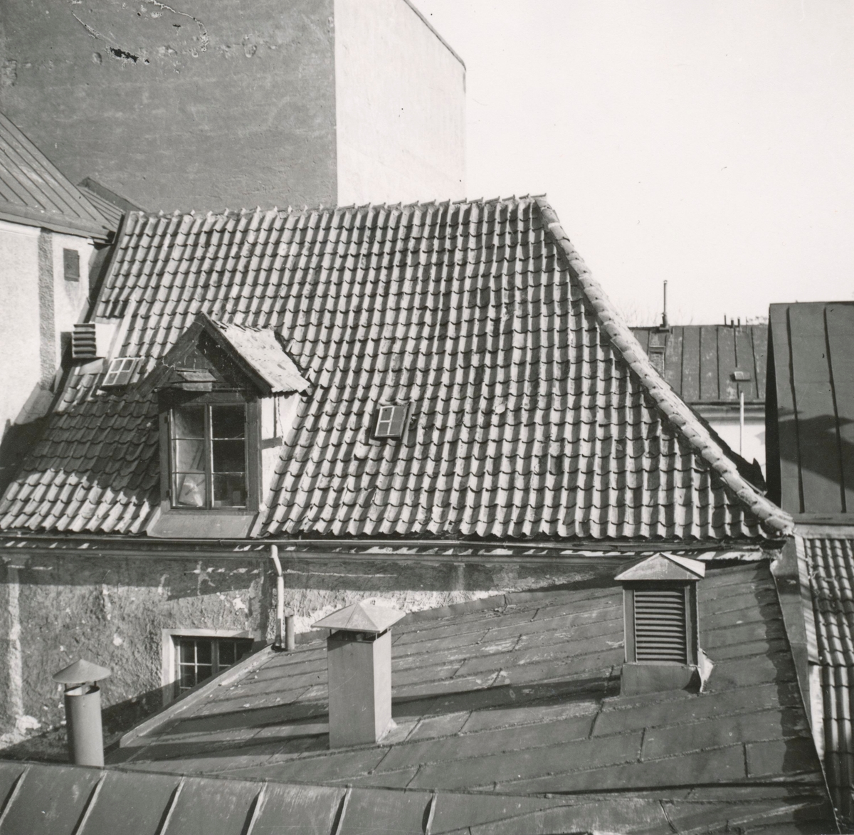 En byggnad med valmat tak och takkupa med hissbom.