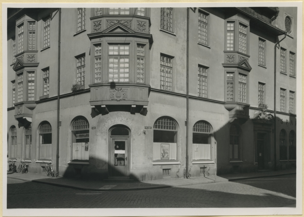Sparbanken i hörnet Larmgatan-Södra Långgatan före 1954 års ombyggnad. Senare har huset byggts om till små affärslokaler samt lägenheter.
