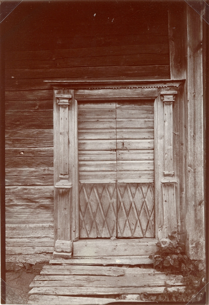 Portal i trä, med pilastrar på en byggnad i Venshult.