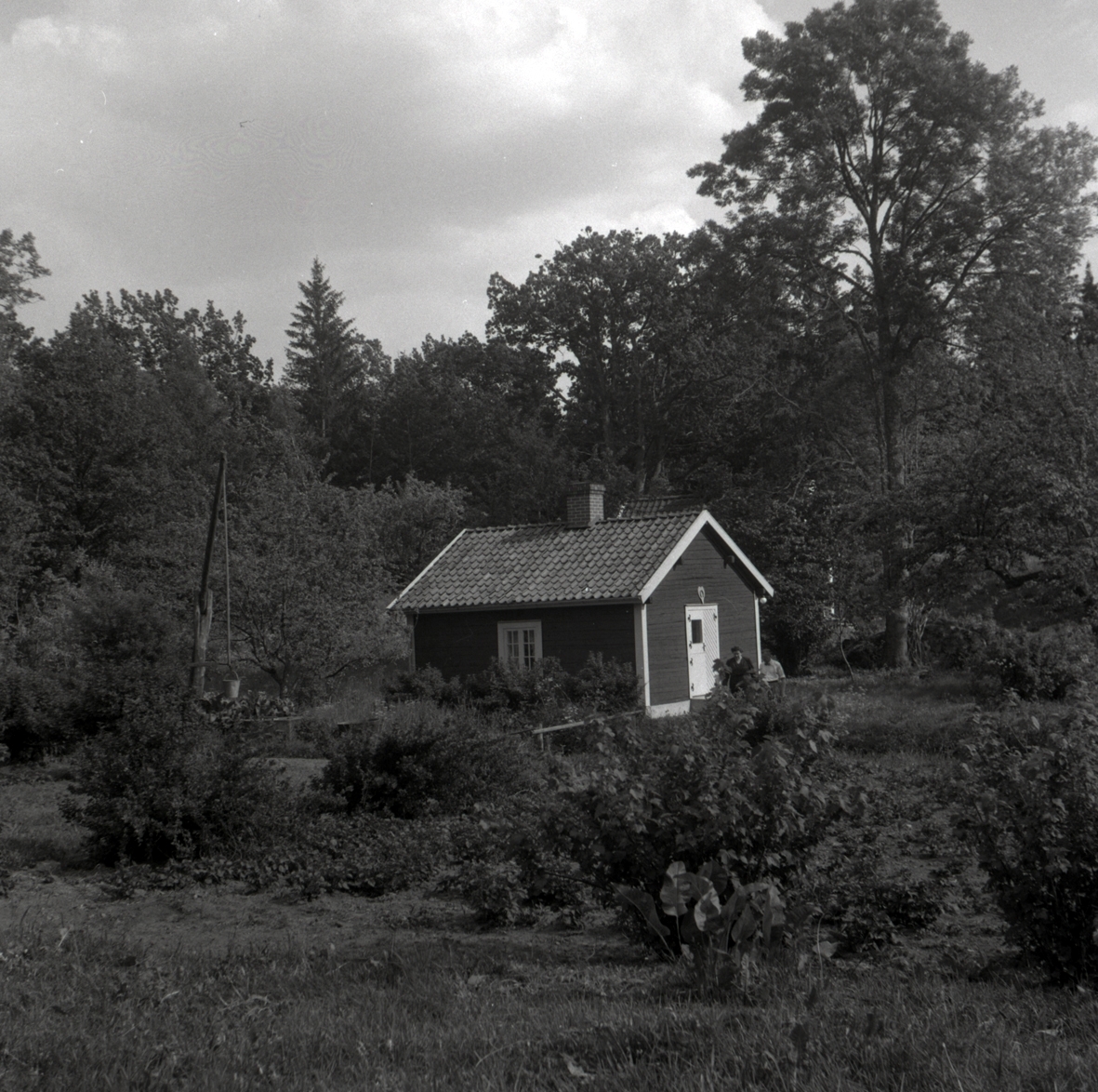 Bostadshus i Lilla Forsa. Opanelad stuga med dörren på gaveln.