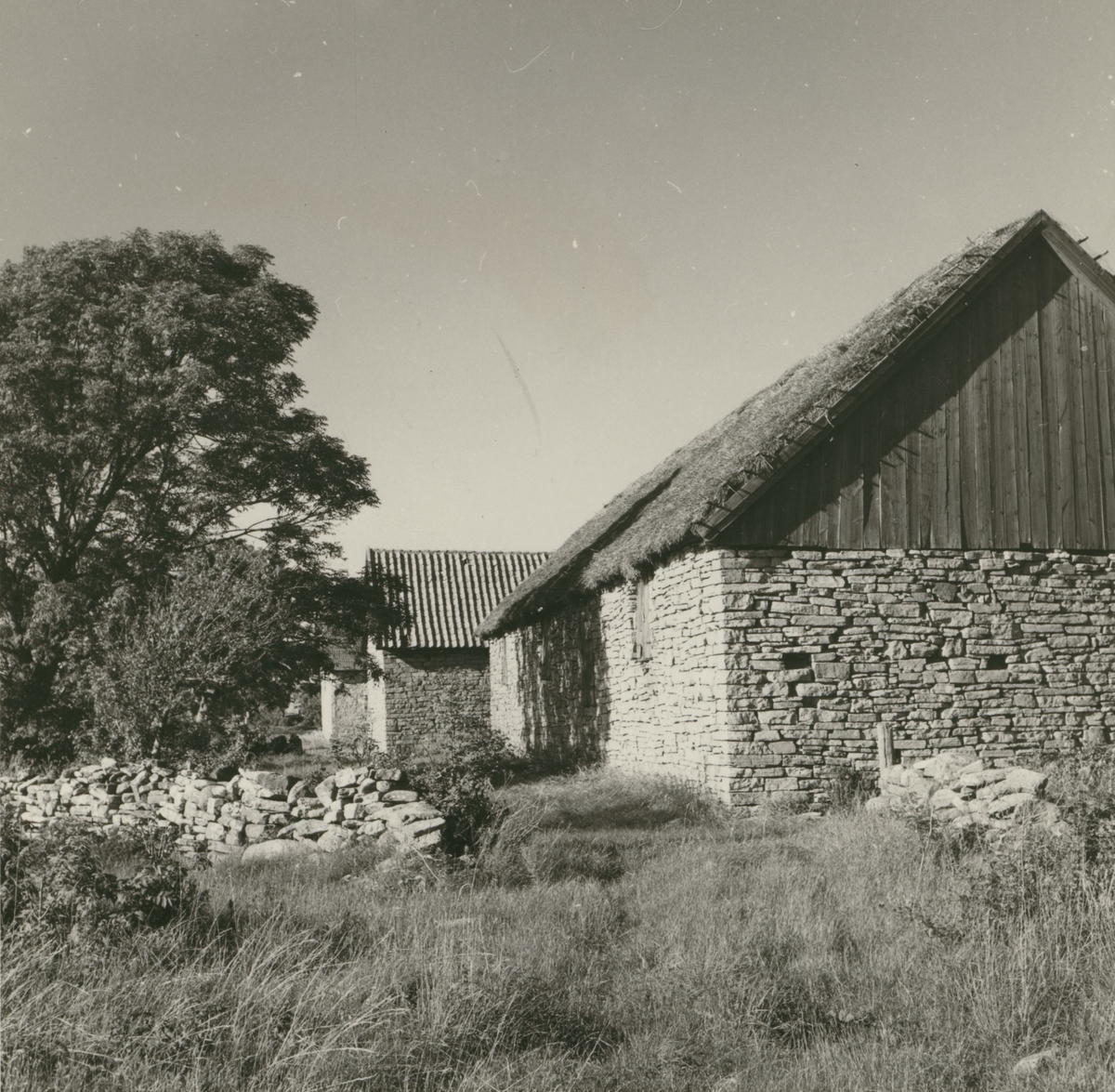 Ekonomibyggnader av sten med stråtak i Äleklinta.