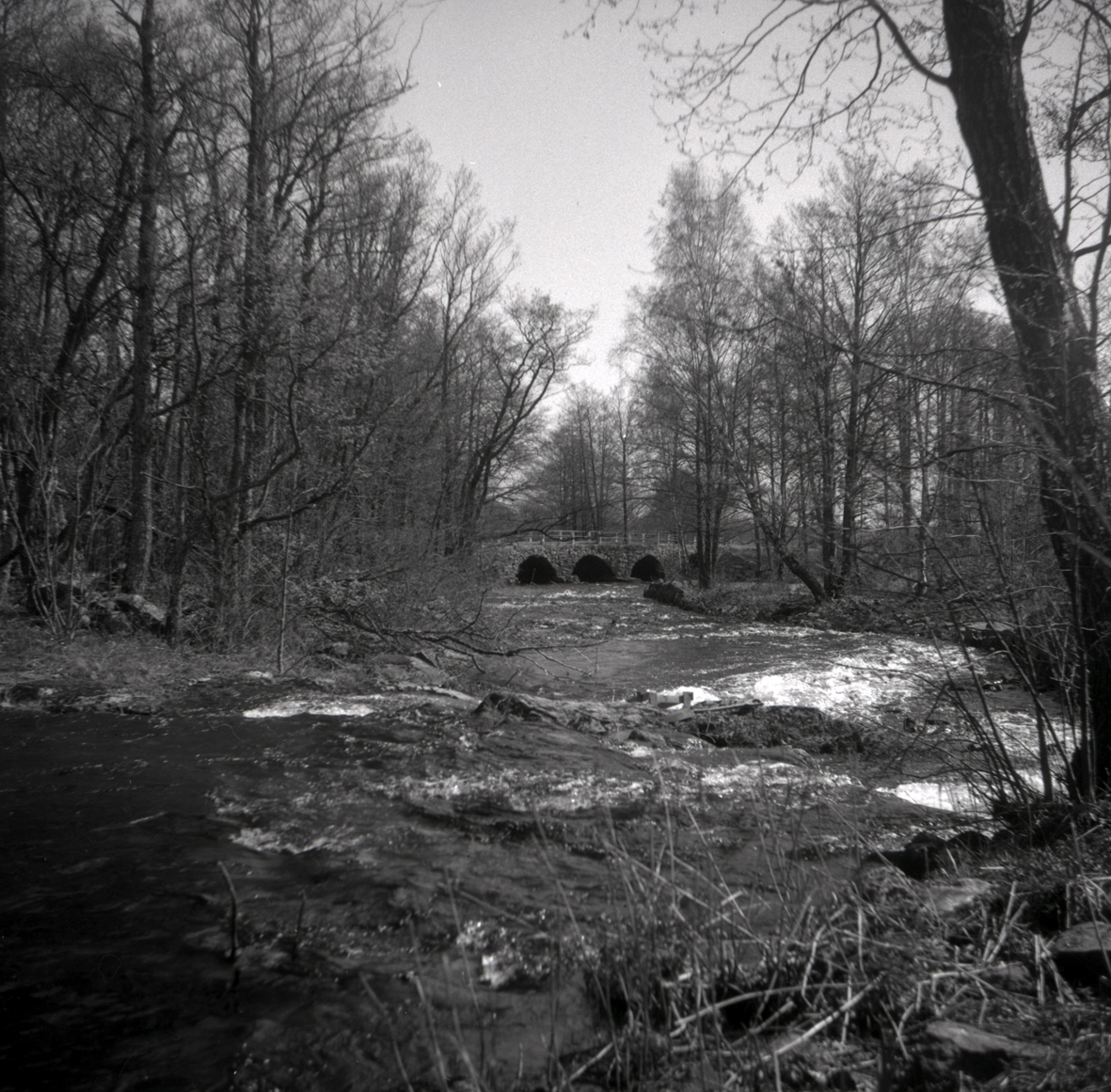 Landskap med å och valvbro i bakgrunden, okänd ort.