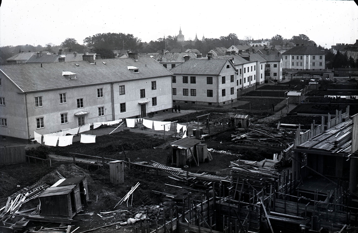 Kalmar Västra under byggnad. Till vänster hänger tvätt på tork.