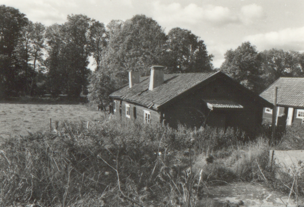 En ryggås- och parstuga med ekonomibyggnader, invid en äng.