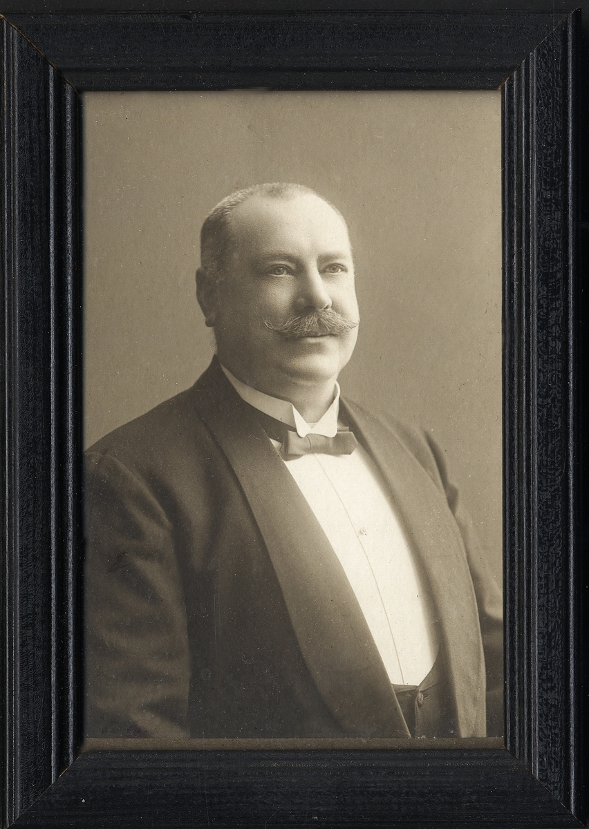 En medelålders man med mustasch, klädd i frack med stärkkrage och fluga.