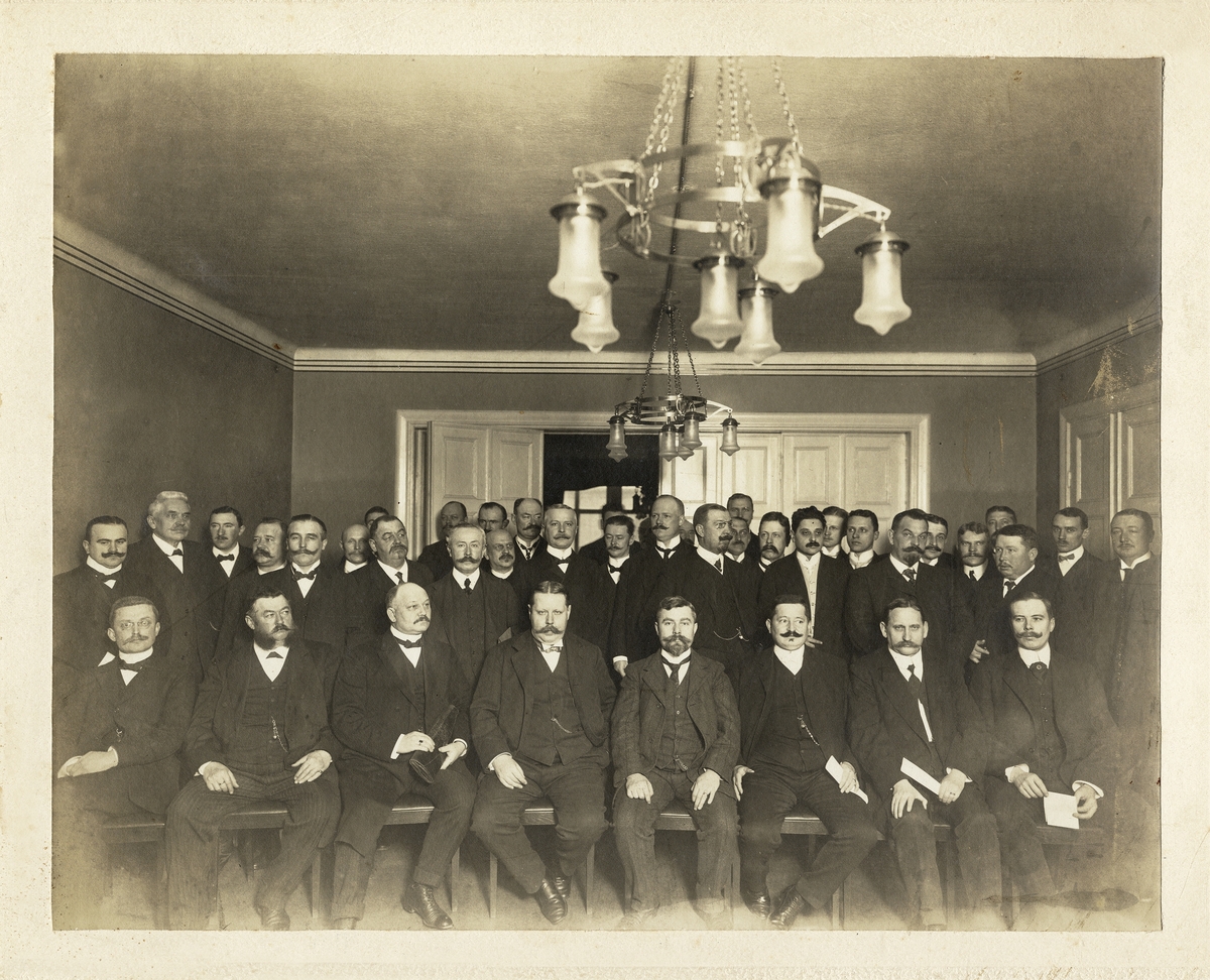 En grupp herrar i mörka kostymer med väst m.m. är avfotograferade i en sal.