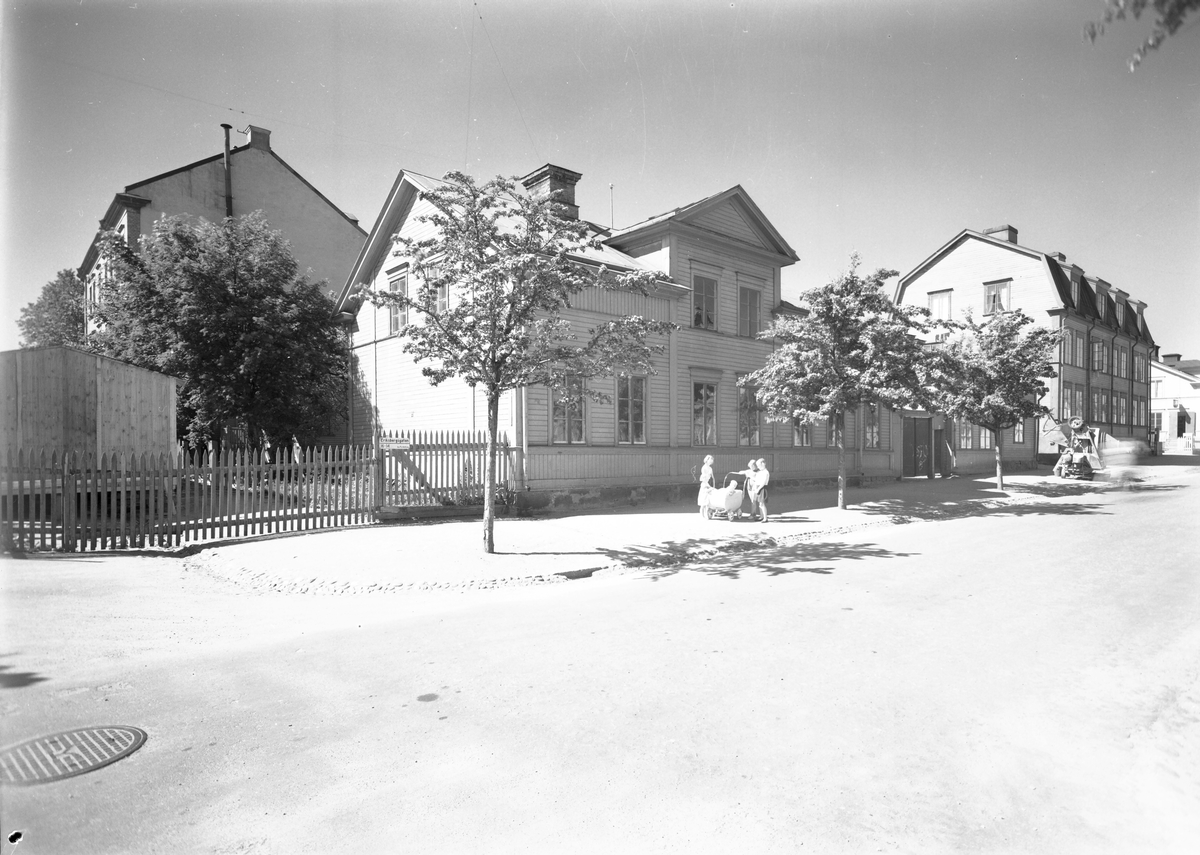 Huset i mitten är Erikbergsgatan 16, Gävle. Fotografen står i korsningen med 4:e Tvärgatan.